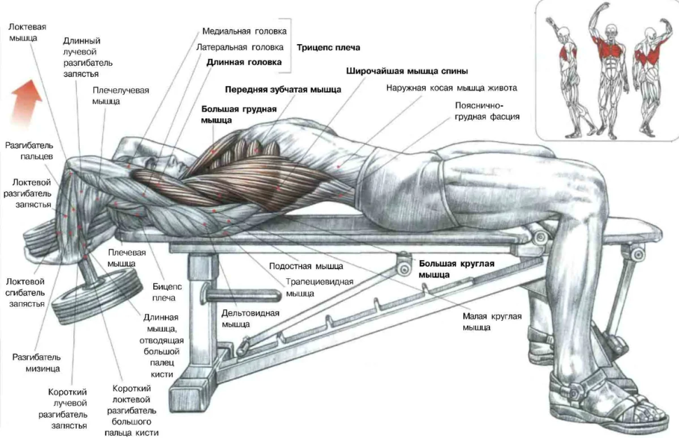 31. Жим гантелей лежа на скамье какие мышцы работают