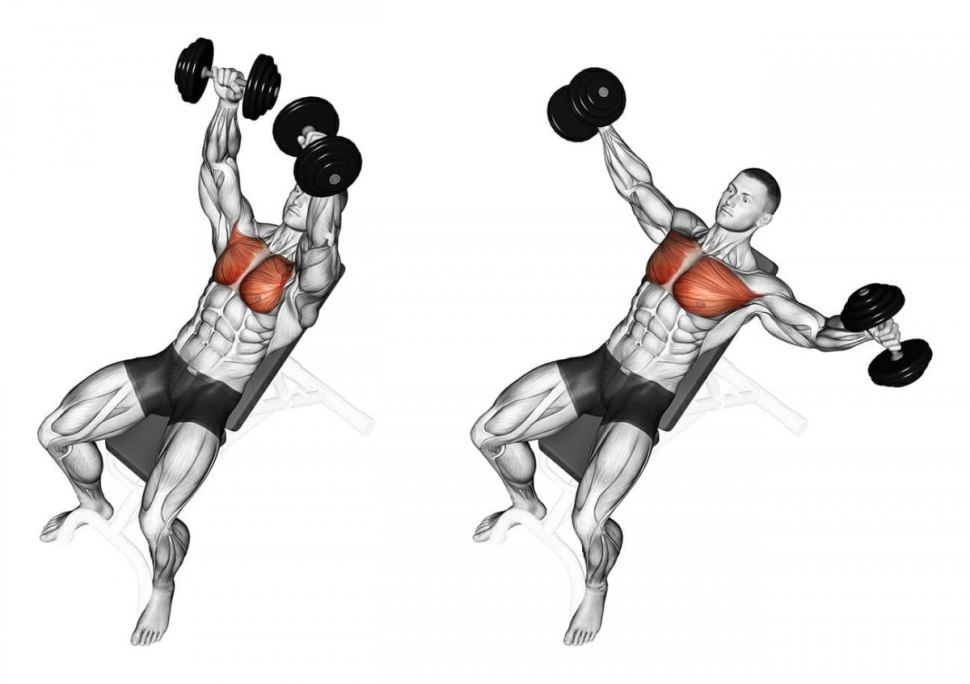 57. Разводка с гантелями на наклонной скамье 30 градусов